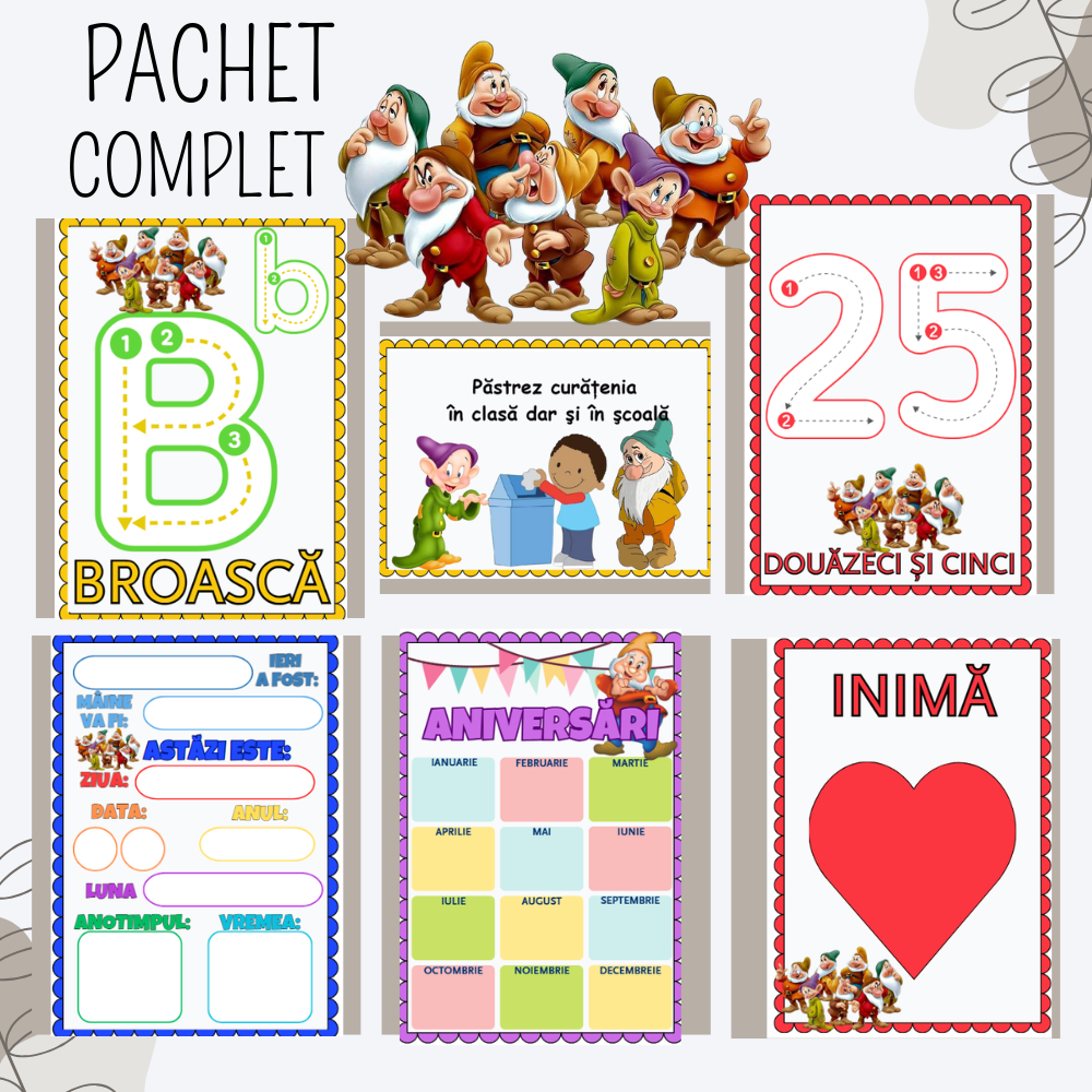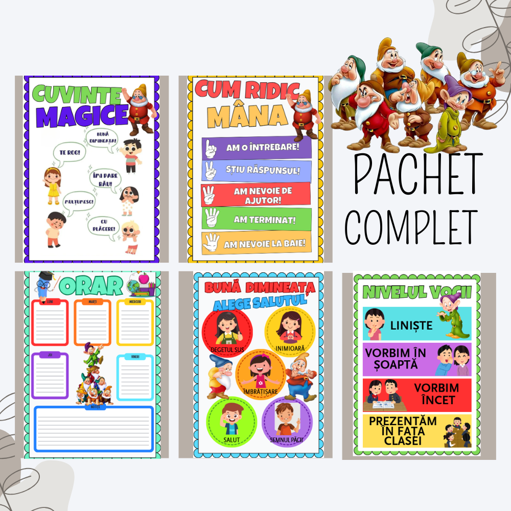 Acest Pachet Educațional Complet este conceput pentru a răspunde tuturor nevoilor de organizare și activități educative dintr-o sală de clasă sau de acasă. Include 11 materiale vizuale printabile în format PDF, gândite special pentru copii între 3 și 10 ani.